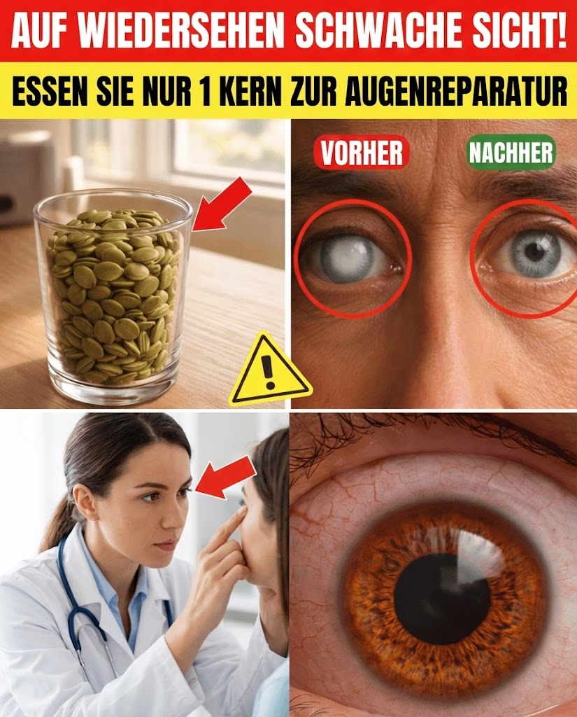 Mahle 1 EL Chia und 1 EL Leinsamen (oder verwende fertiges Mehl). Mische mit 1 EL Kürbiskernen ins Frühstück. Optional: Ingwertee dazu für zusätzliche Durchblutung. Notiere täglich deine Einschätzung von Seh‑ und Denkstärke auf einer Skala von 1–10 – viele spüren sanfte Veränderungen innerhalb von 4–12 Wochen. Dieses kleine Ritual kann deine Augen und dein Gehirn langfristig nähren.